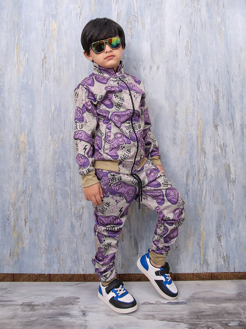 Designed for young gamers, this Kids Gamer Tracksuit showcases an all-over "Level Up" sublimation print in striking purple tones. Made from soft, durable fabric, it combines comfort and style for both playtime and lounging.